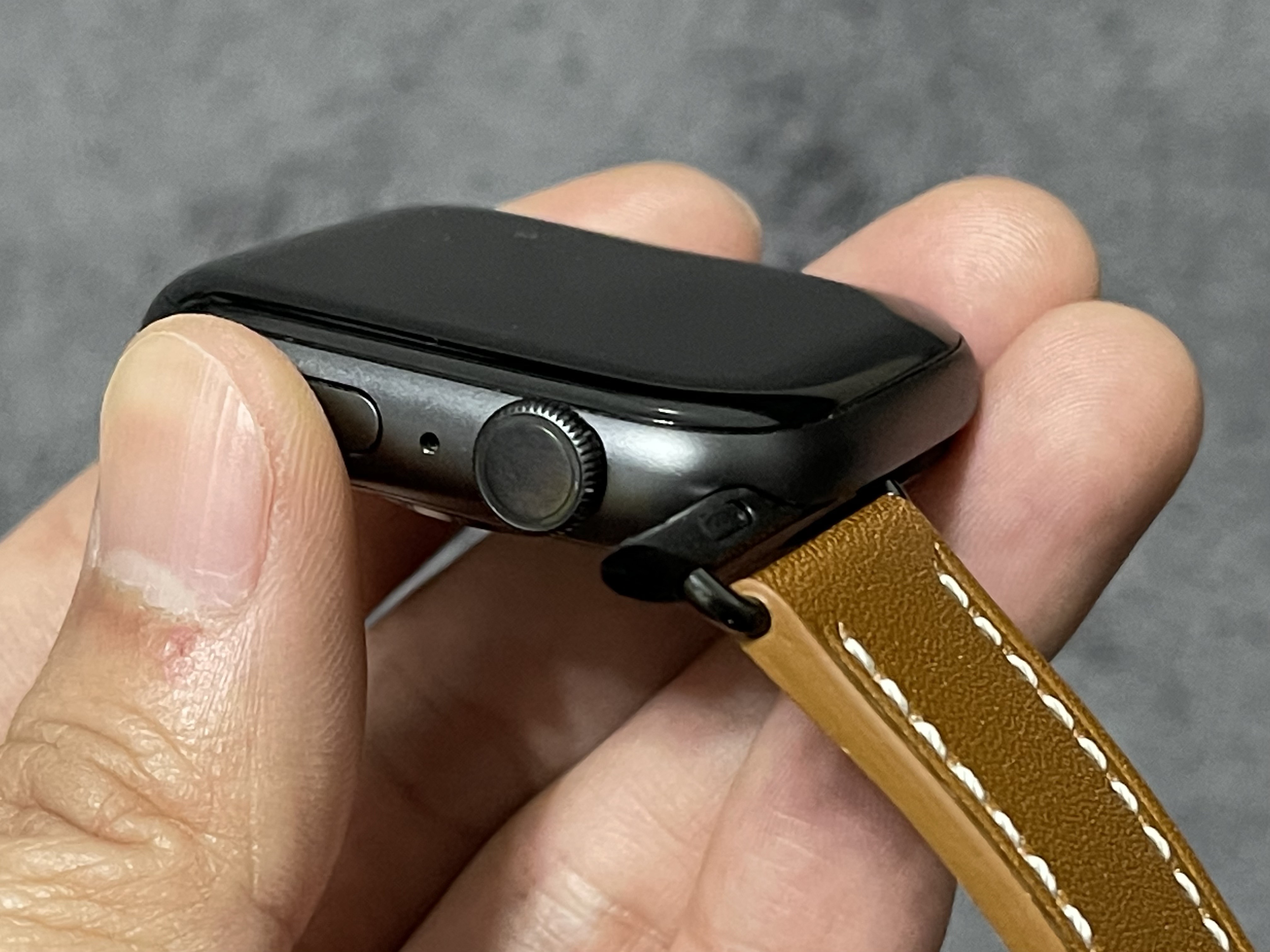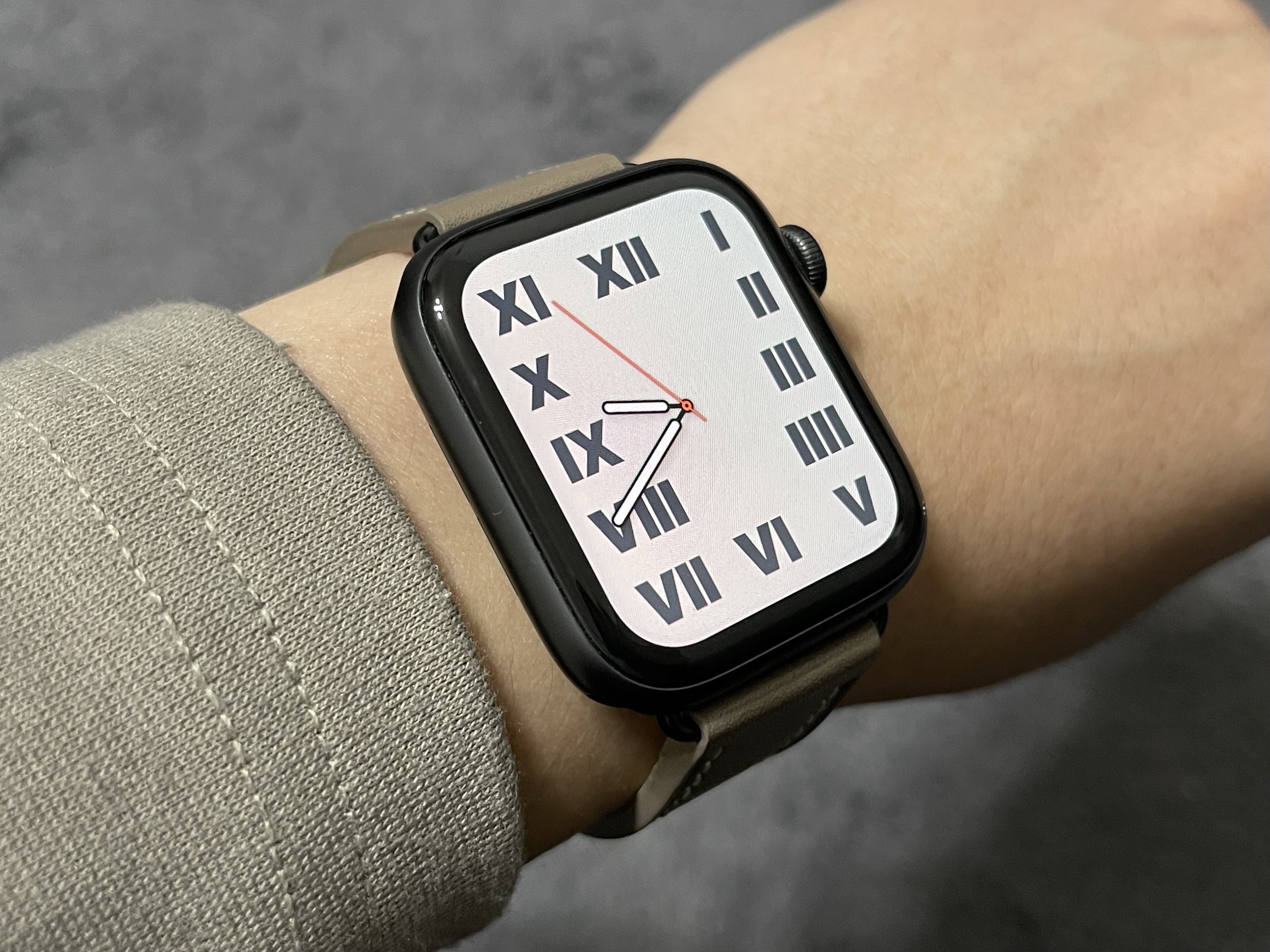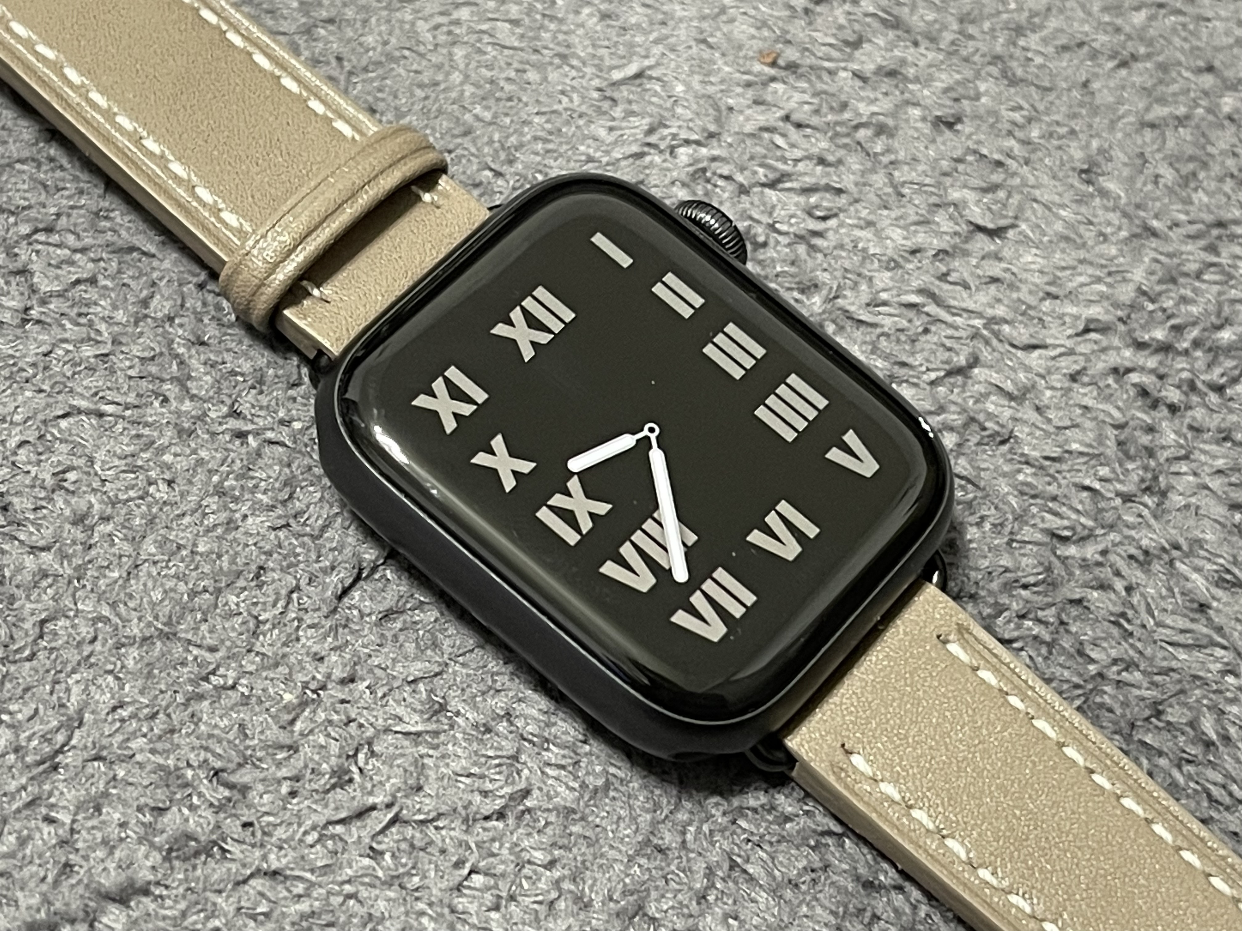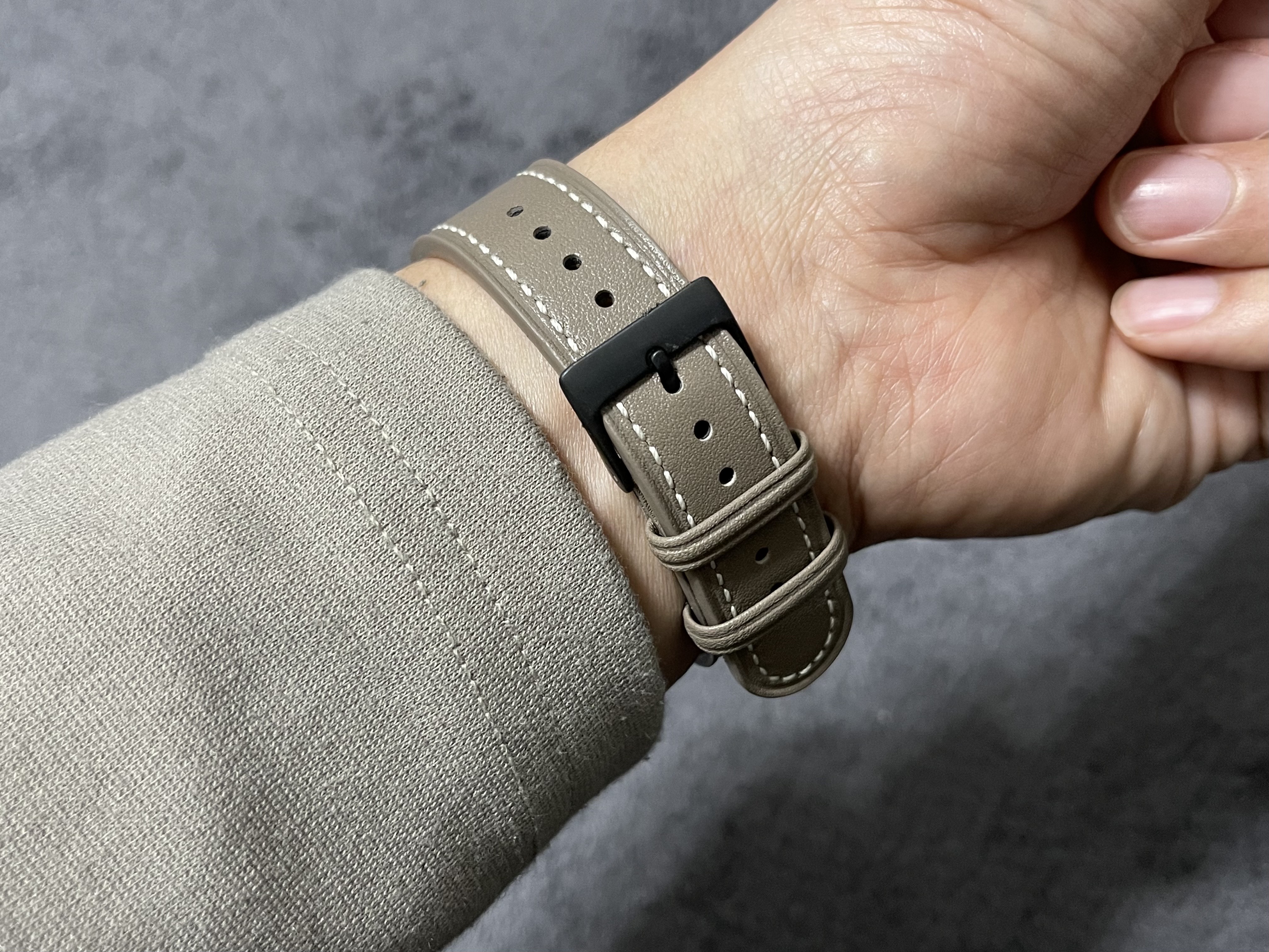 웜그레이 색상의 로이드 스트랩을 애플워치에 장착한 모습입니다.