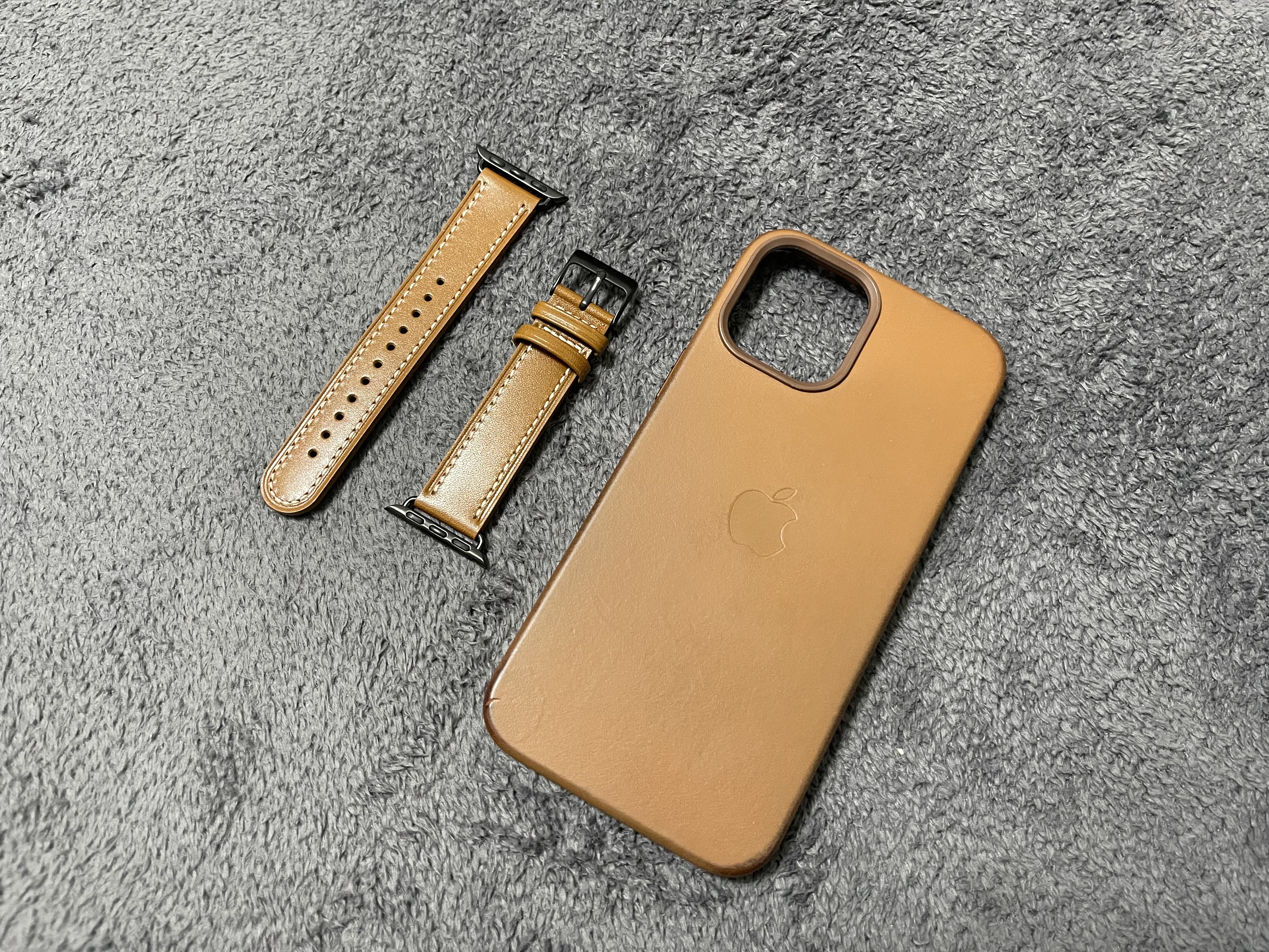 아이폰 가죽케이스가 조금 더 매트한 느낌이고 로이드 애플워치 가죽스트랩은 조금의 광이 있습니다.