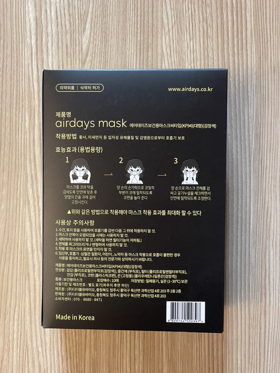 이번에는 저번과는 다른 블랙 칼라 에어데이즈 마스크입니다.