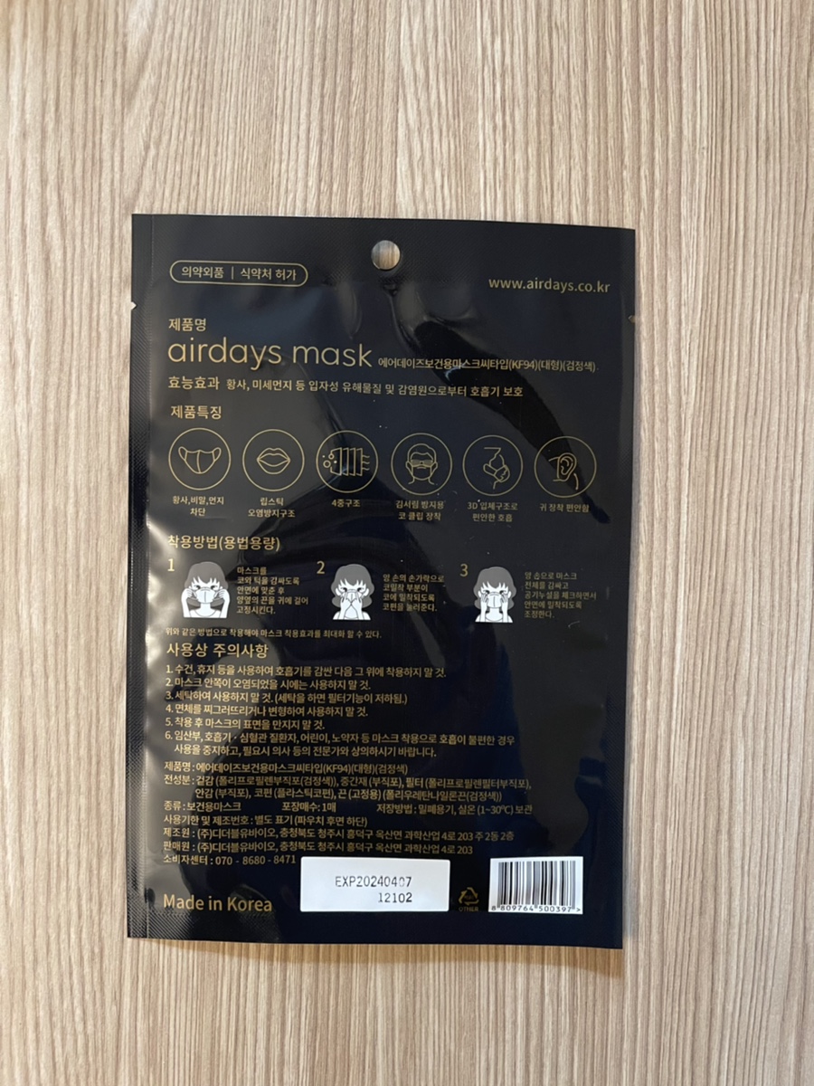 에어데이즈 마스크 박스 뒤에 적혀 있는 내용이 개별 패키지 뒷면에도 그대로.