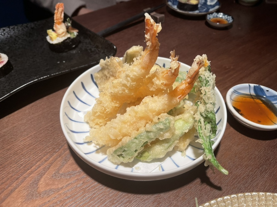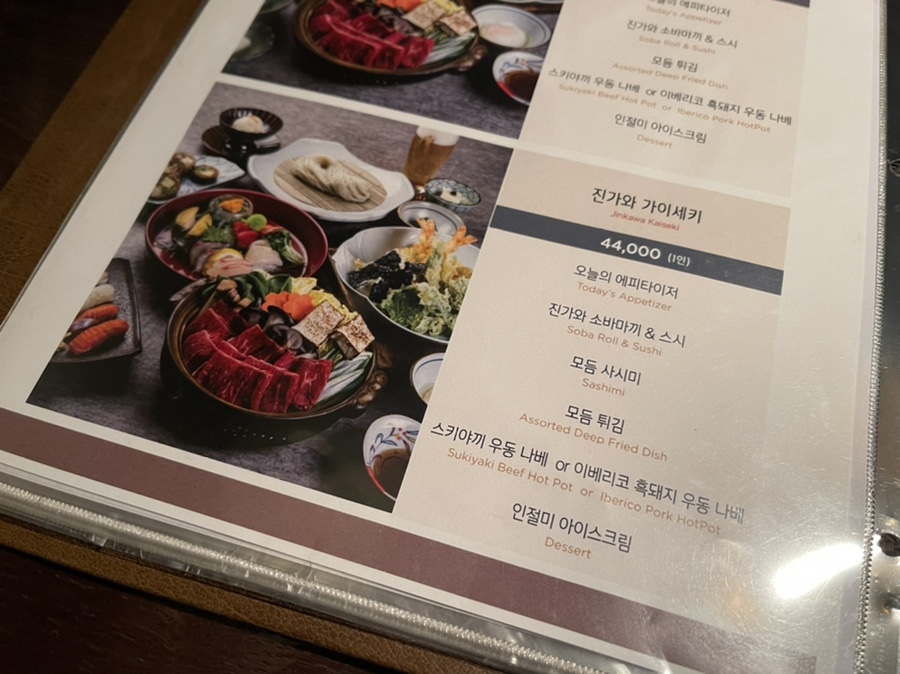 코스는 에피타이저, 소바마끼와 스시, 모둠 사시미, 모둠 튀김, 스키야끼 우동나베, 인절미 아이스크림으로 구성되어 있습니다.