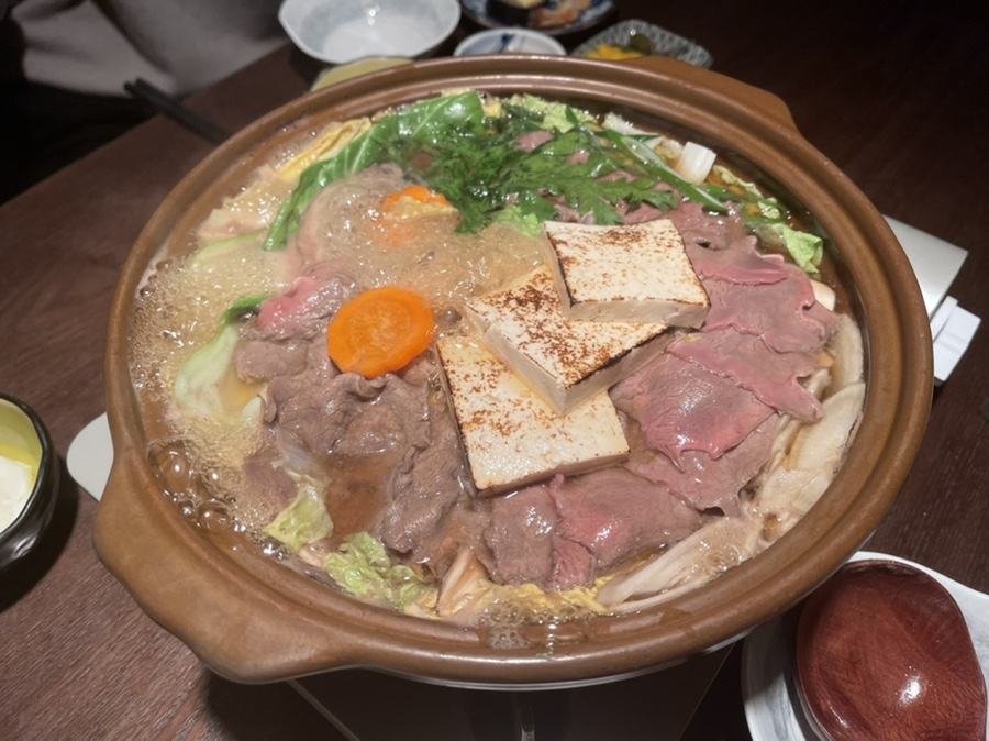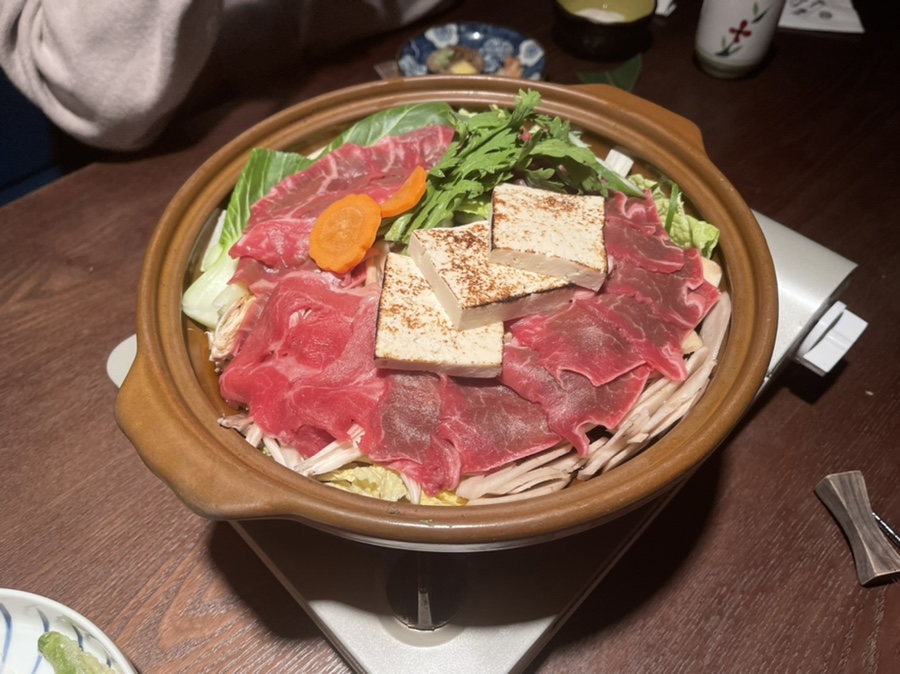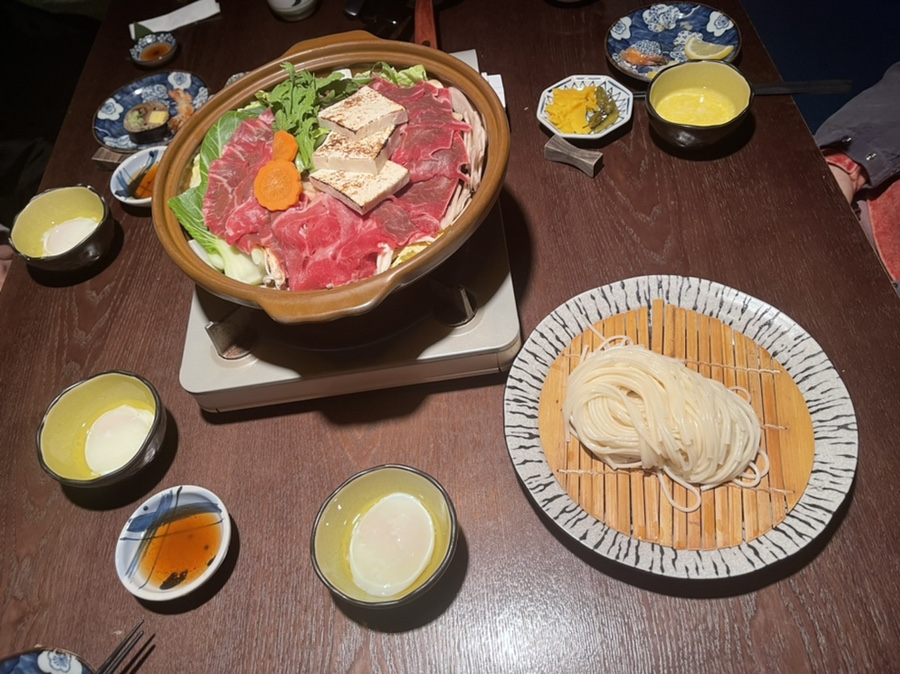 진가와 가이세키 세트의 메인인 스키야끼 우동 나베입니다.