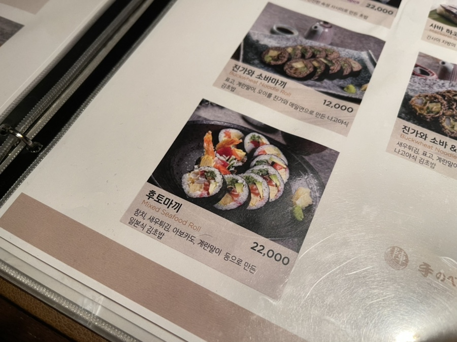 저희는 진가와 가이세키 코스요리 3인분에 추가로 후토마끼를 주문했습니다.