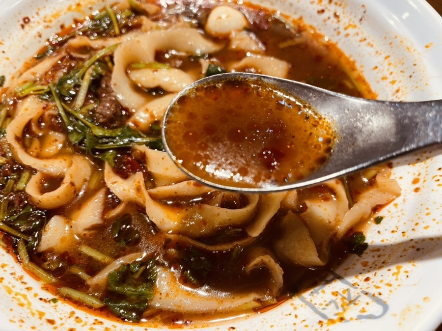 거대한 반죽 덩어리를 칼로 깎아서 만드는데 면 두께가 일정하지 않아 식감이 특이합니다. 약간 면이 아닌 수제비 먹는 느낌.