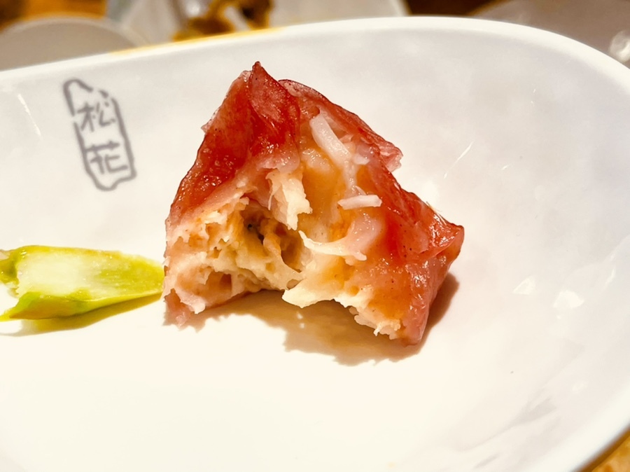 딤섬의 안은 새우를 다진 소로 채워져 있습니다.