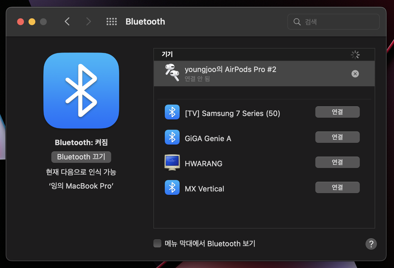 블루투스 목록에 MX VERTICAL이 떠 있습니다.