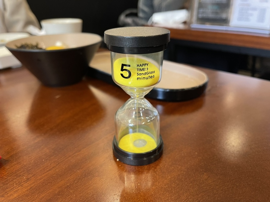 면을 넣은 후 식탁 위 모래시계를 돌려서 다 떨어지면 먹으면 된다고 합니다.
