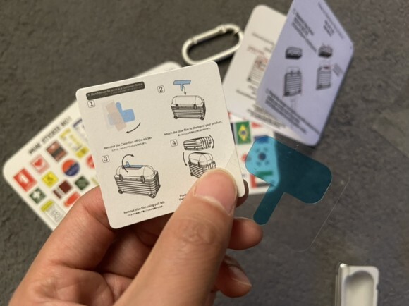 캐리어 에어팟 프로케이스와 데커할 수 있는 스티커, 설명서, 윗 뚜껑 고정용 양면 테이프로 구성되어 있습니다.